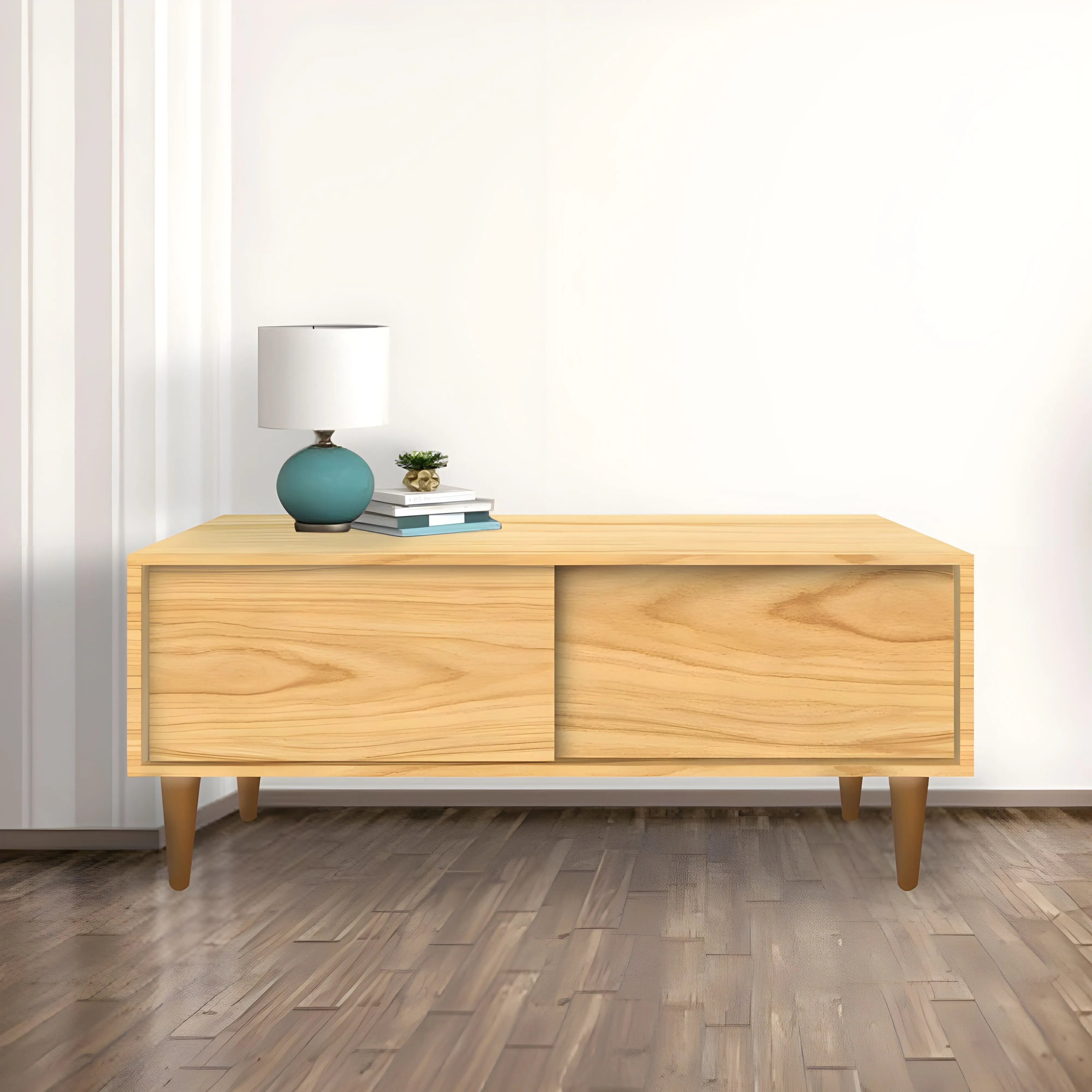 The console table with a sliding door in veneer is a stunning piece of furniture that seamlessly combines style and functionality. Crafted from high-quality veneer, this table boasts a sleek and elegant finish that is sure to impress. The sliding door, made from the same premium veneer, provides ample storage for magazines, books, and other decorative items. The console table's design is both modern and timeless, making it a versatile addition to any space.