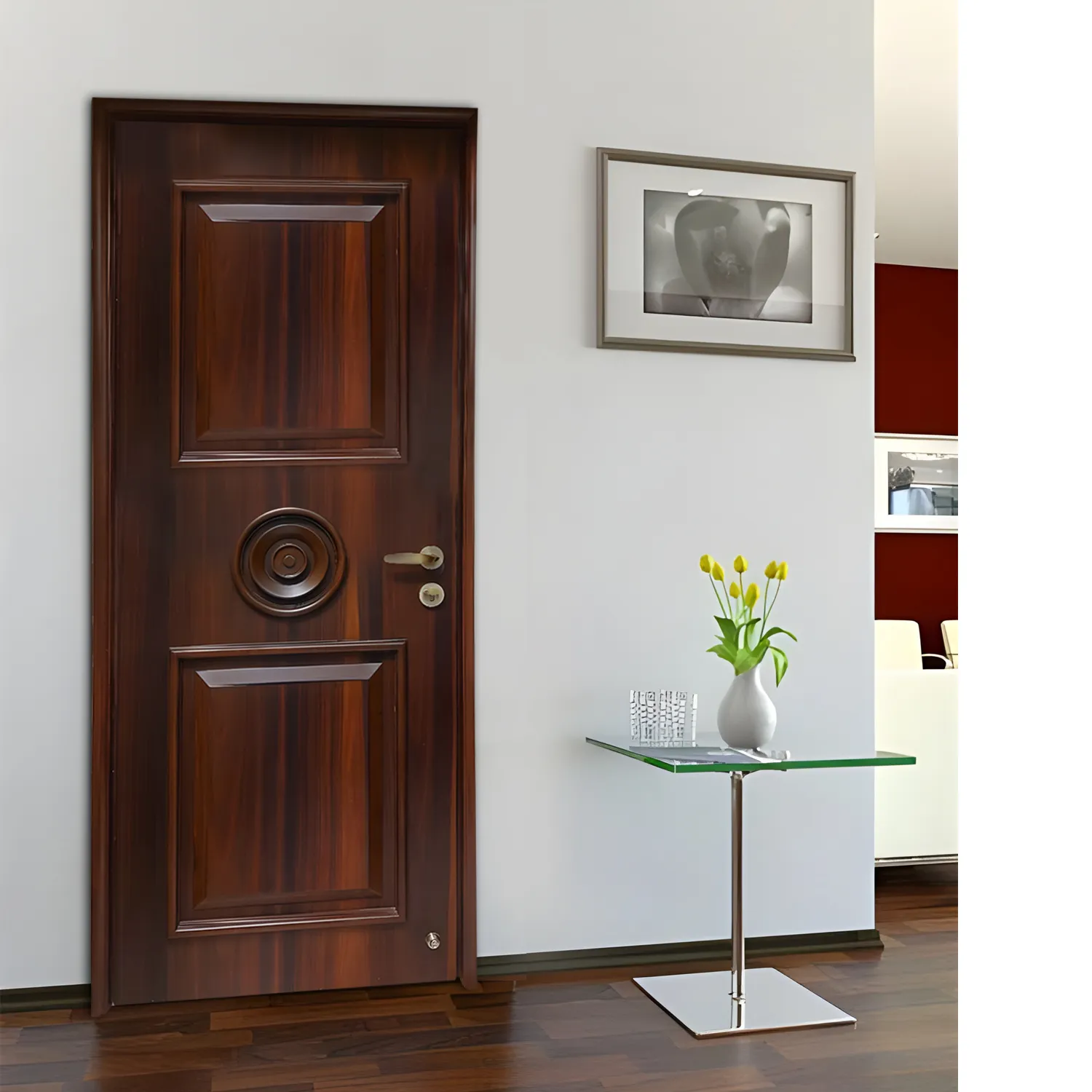 Elevate the entrance to your sanctuary with our exquisite bedroom door. This door is crafted from durable blockboard and adorned with elegant BTC moulding, adding depth and character to its design. The luxurious Lubriant Elm veneer graces the surface, infusing your bedroom with a sense of refined style and natural beauty. Its standout feature is the captivating round design in the center, a unique and eye-catching element that makes a striking focal point in your bedroom decor. With this door, you're not just welcoming guests; you're inviting them to experience your impeccable taste and the serene haven that lies beyond.