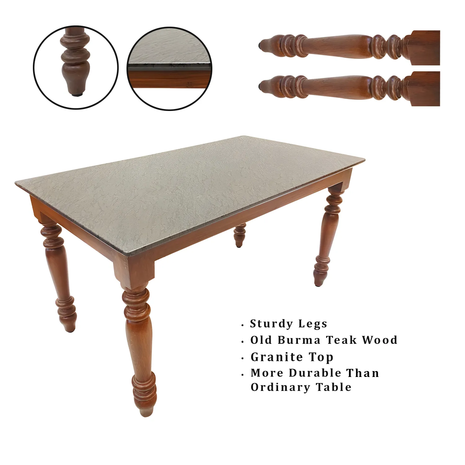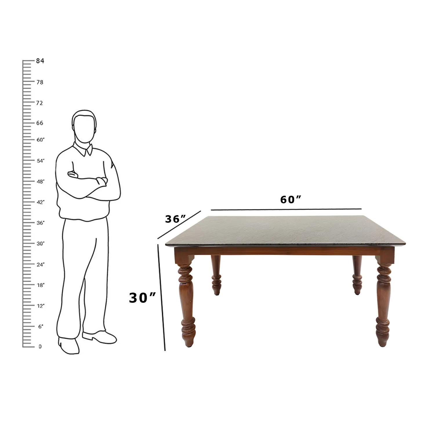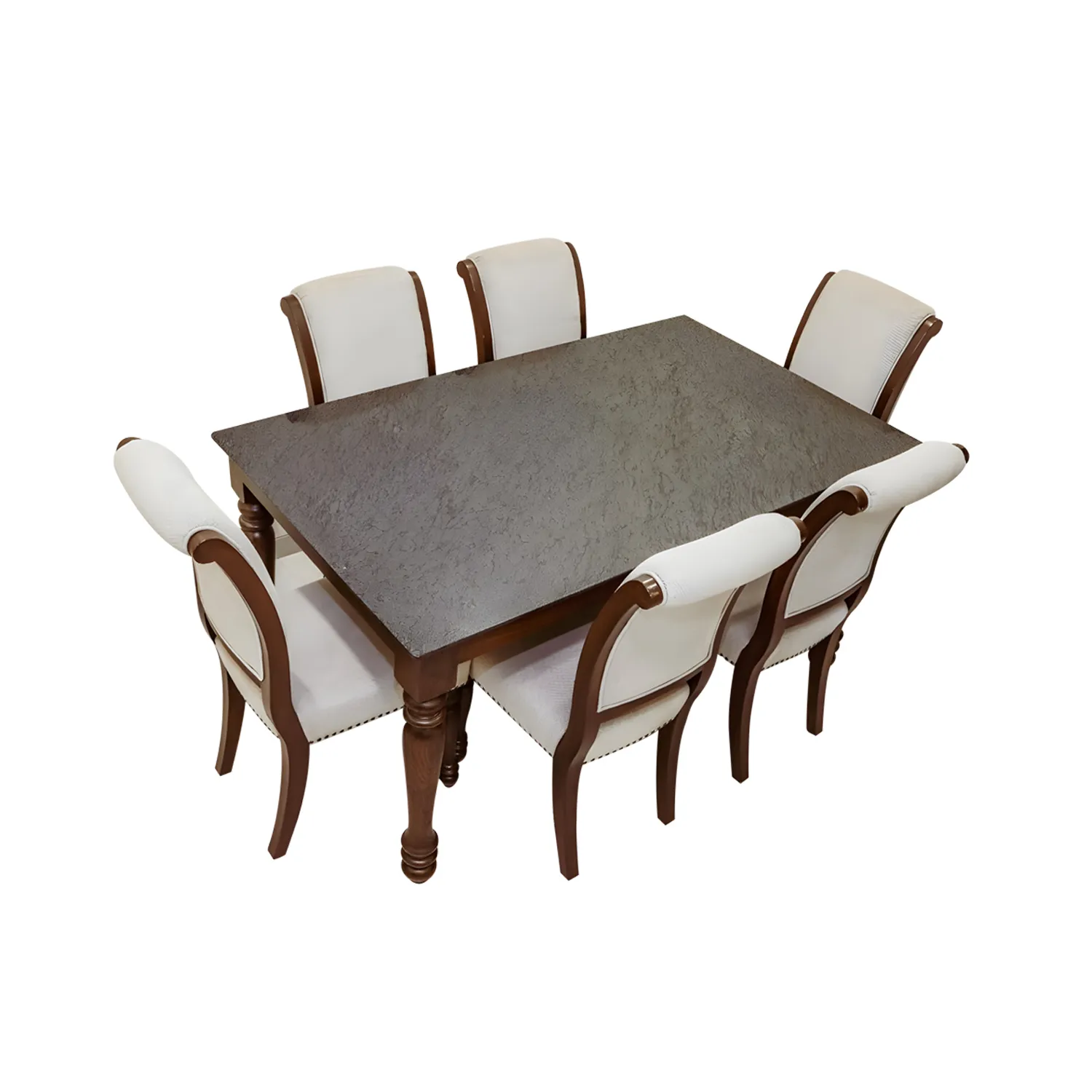 The dining table in the image is a rectangular table with a glass top and wooden legs. The table is about 60 inches long, 36 inches wide, and 30 inches high. The glass top is made of tempered glass, which is strong and durable. The wooden legs are made of solid wood and are sturdy and supportive. The table has a sleek and modern design that would complement any dining room décor. The glass top makes the table look light and airy, while the wooden legs add a touch of warmth and sophistication. The table is also very functional, with plenty of space to seat up to six people.