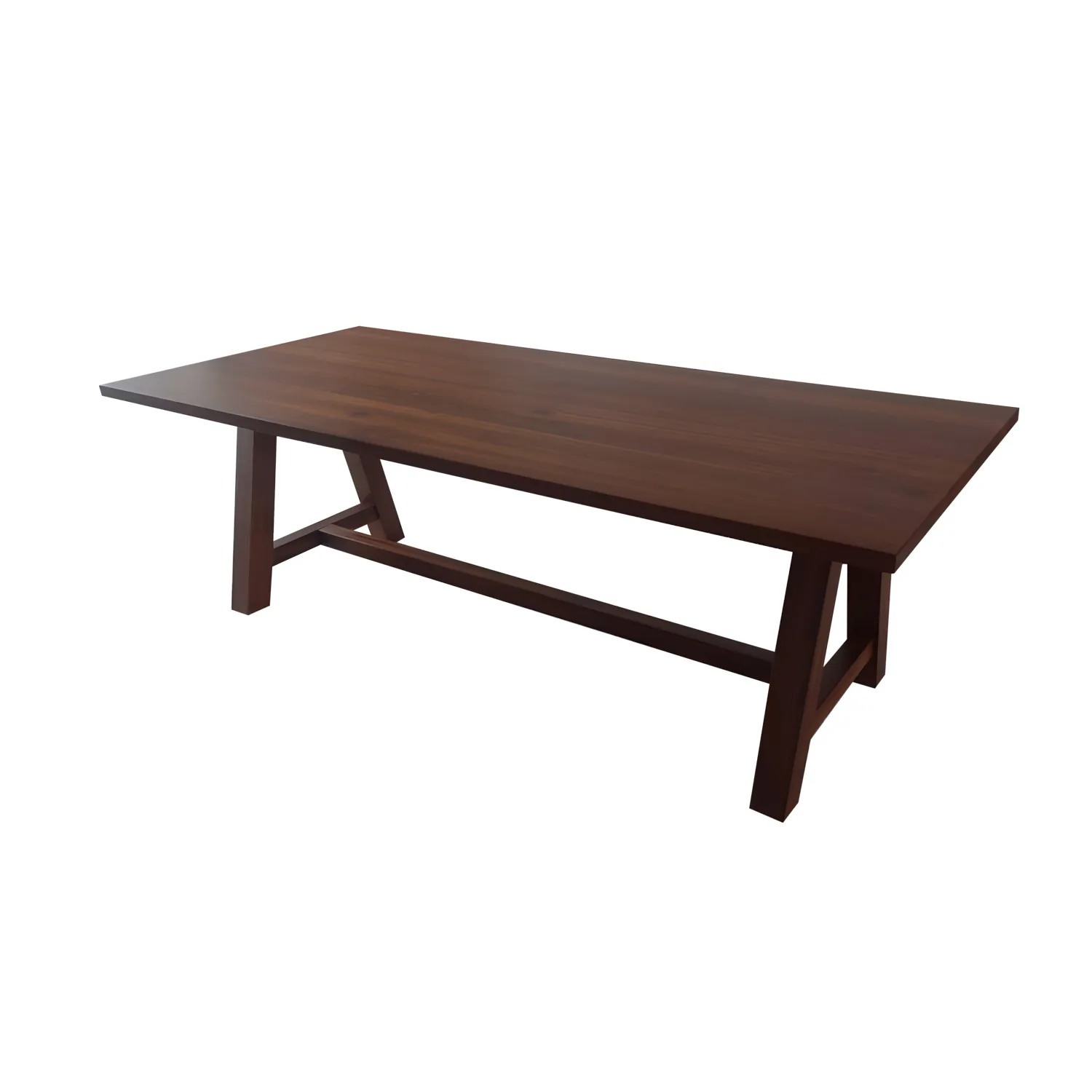 The dining table in the image is a rectangular table, with wooden legs. The wooden legs are made of solid wood and are sturdy and supportive. The table has a sleek and modern design that would complement any dining room décor. the table look light and airy, while the wooden legs add a touch of warmth and sophistication. The table is also very functional, with plenty of space to seat up to six people.