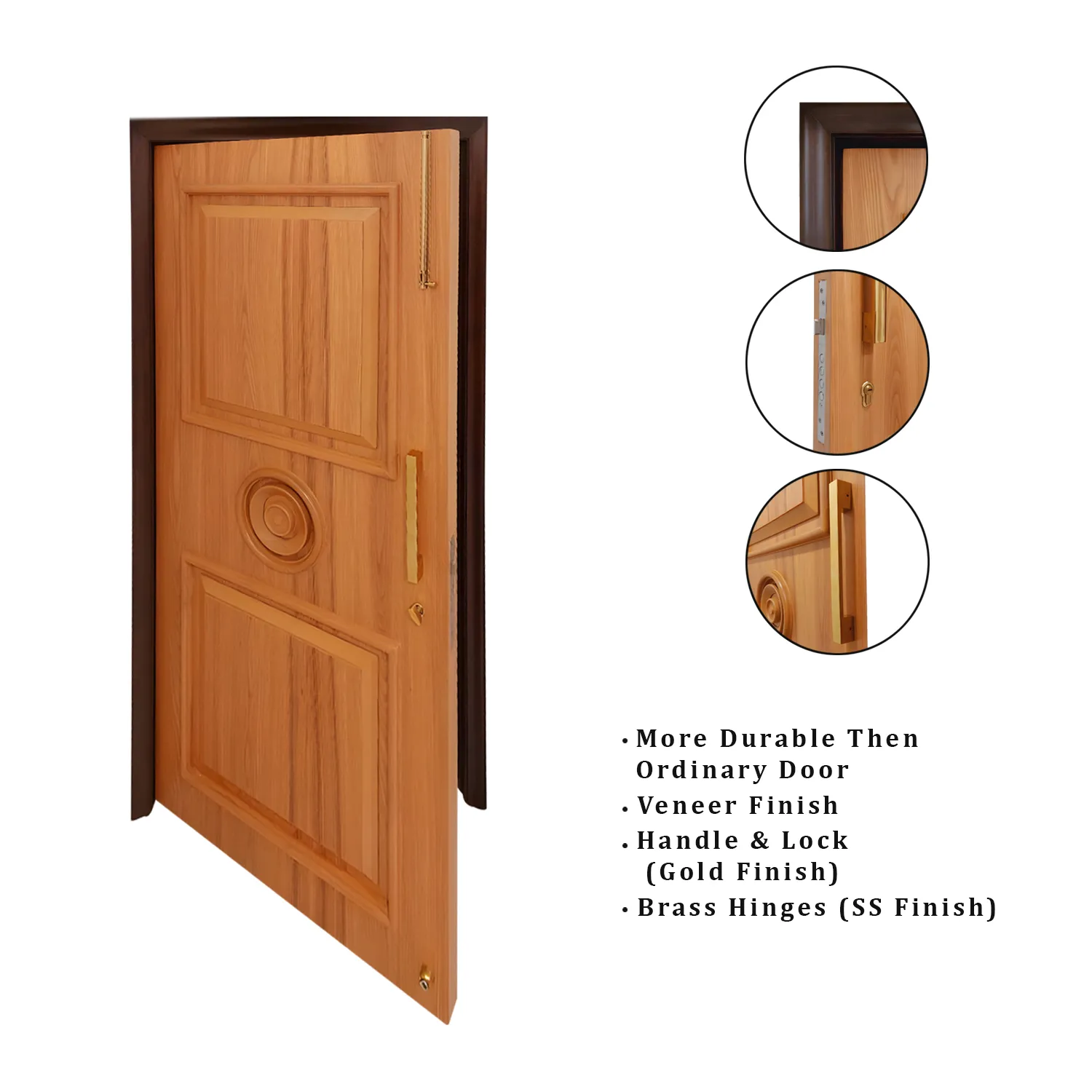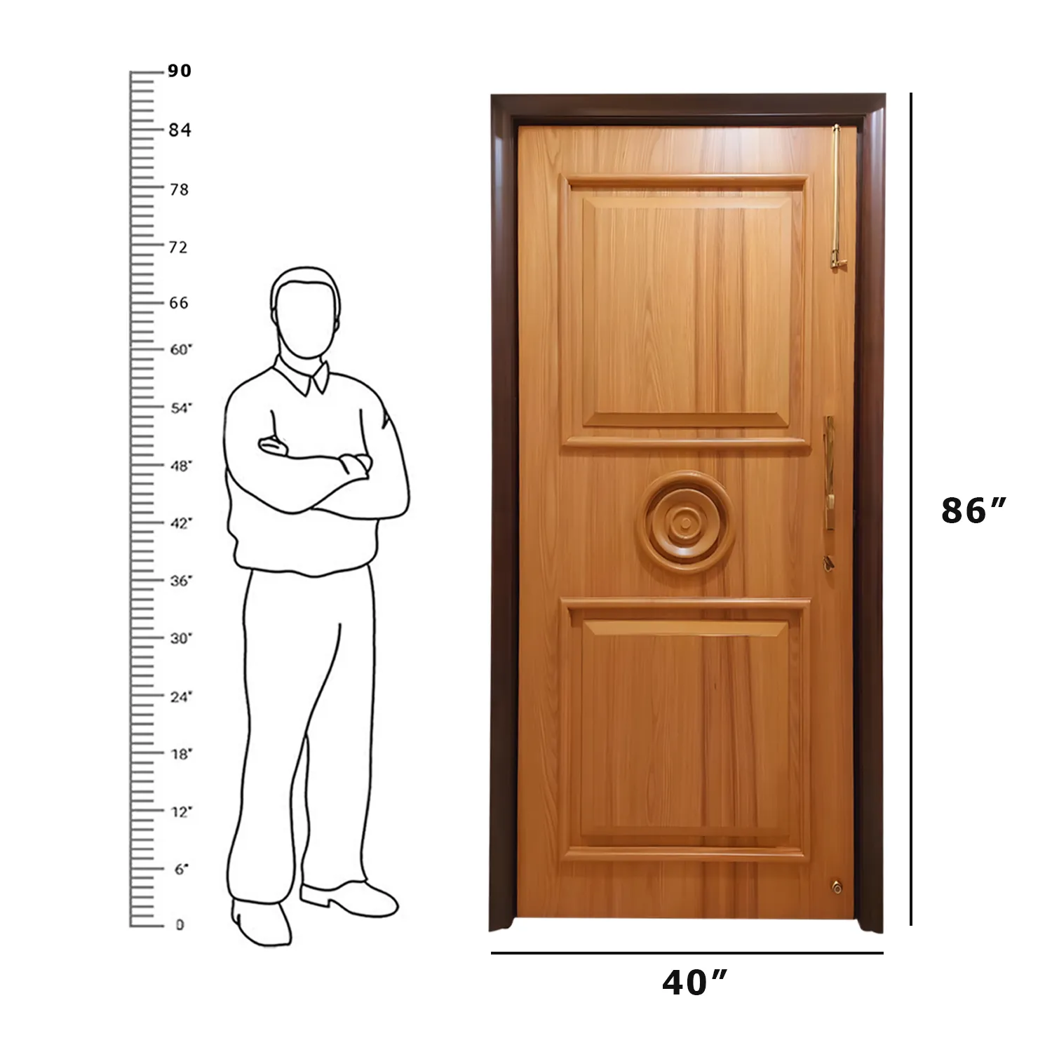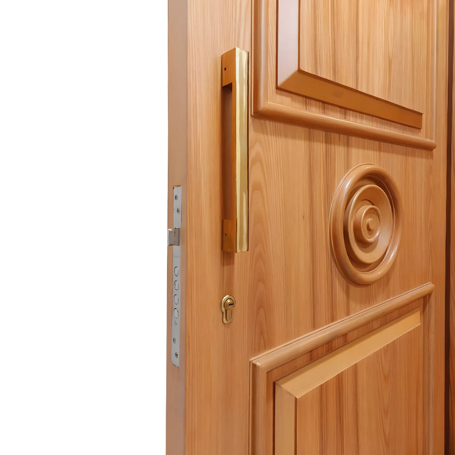 A stunning wooden door with a captivating circular design, crafted from rich, dark wood and adorned with a lighter wood swirl pattern that gracefully adorns its center. This elegant door boasts a weather-resistant finish, ensuring its enduring beauty against the elements. Its simple metal handle and hinges complement its timeless design, making it a seamless addition to any architectural style.
