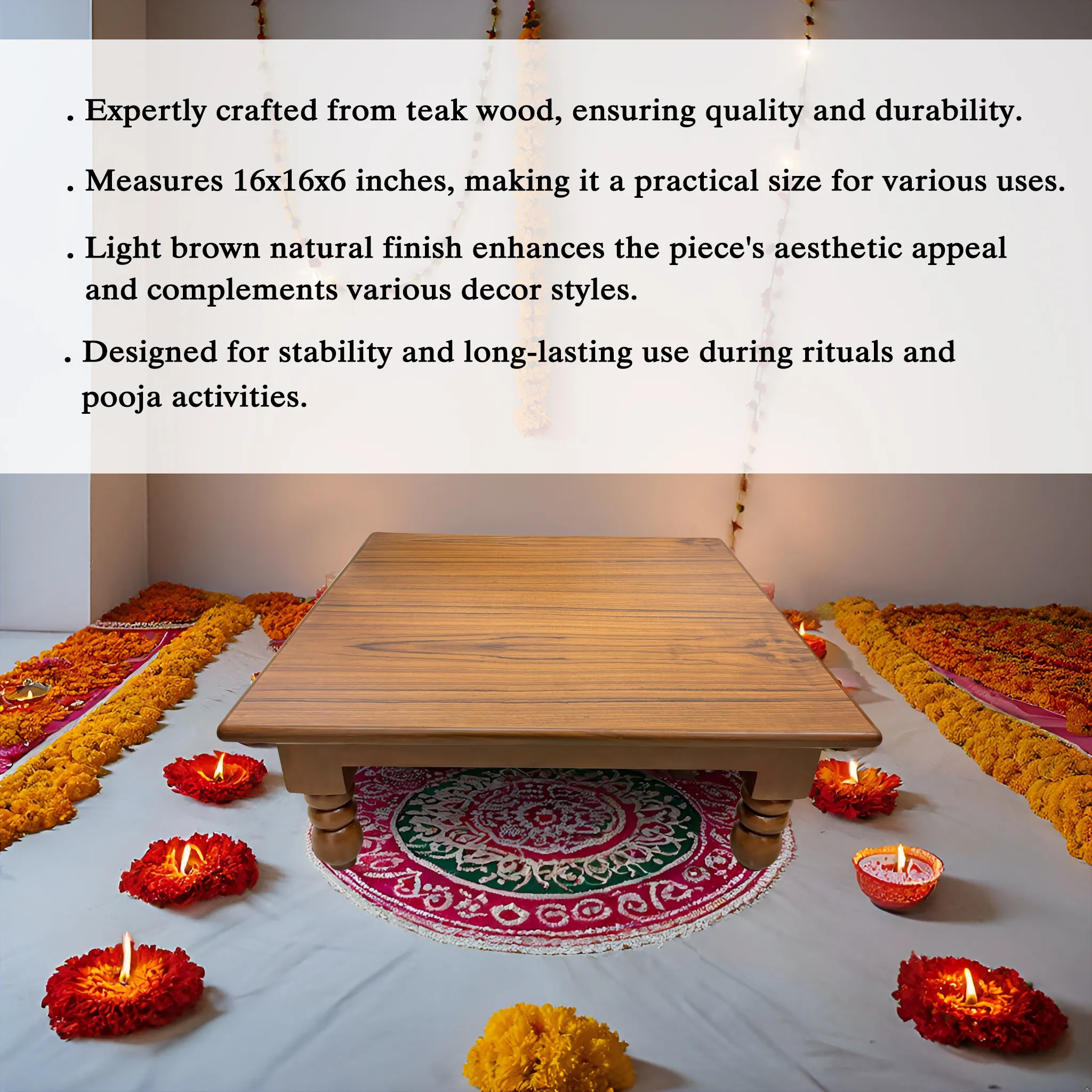 Our wooden pooja chowki is a beautifully crafted piece that is designed to serve as a sacred space for prayer and meditation. our wooden pooja chowki is a beautifully crafted piece that combines traditional design elements with modern functionality. Its sturdy construction, spacious top, and elegant design make it a practical and stylish addition to any prayer space.