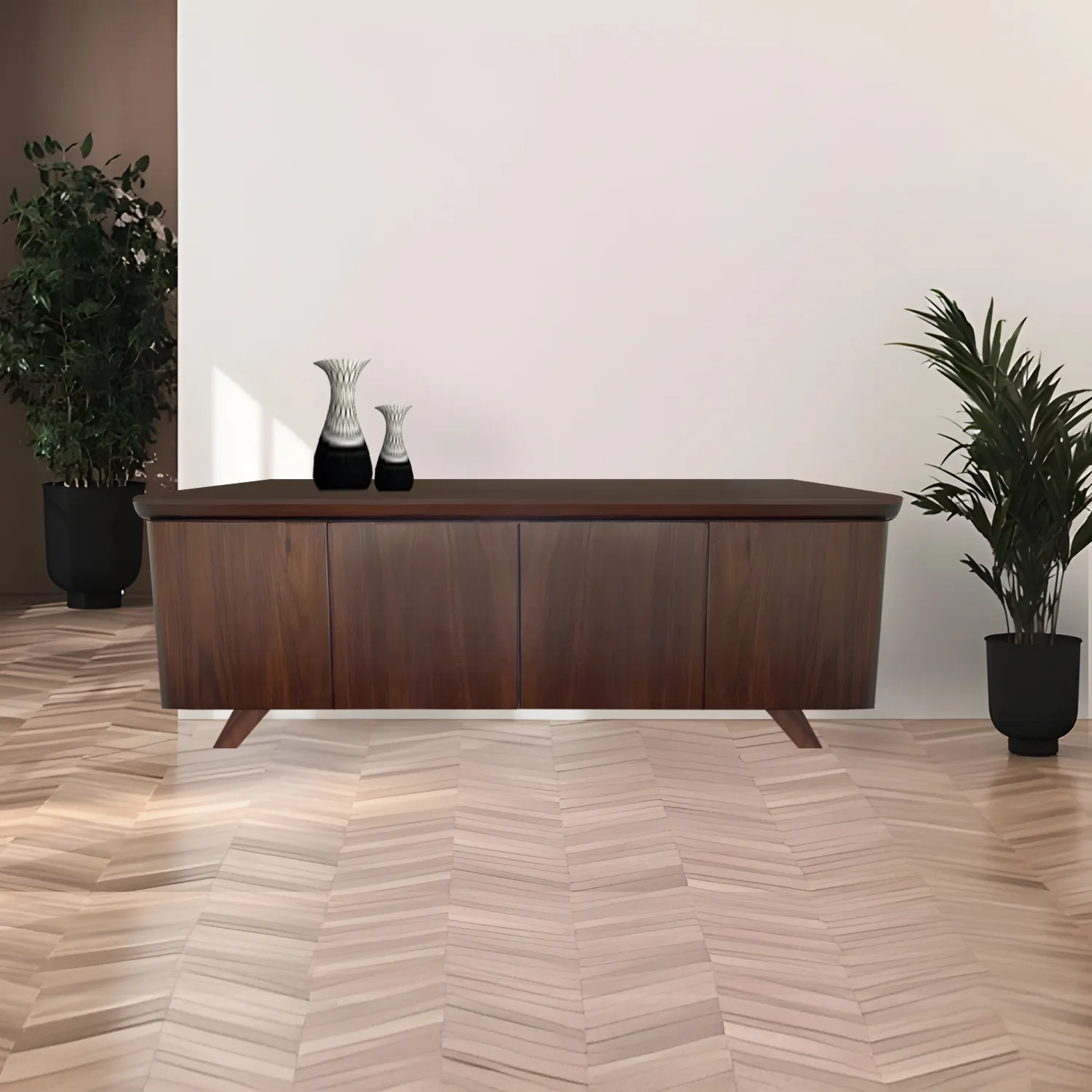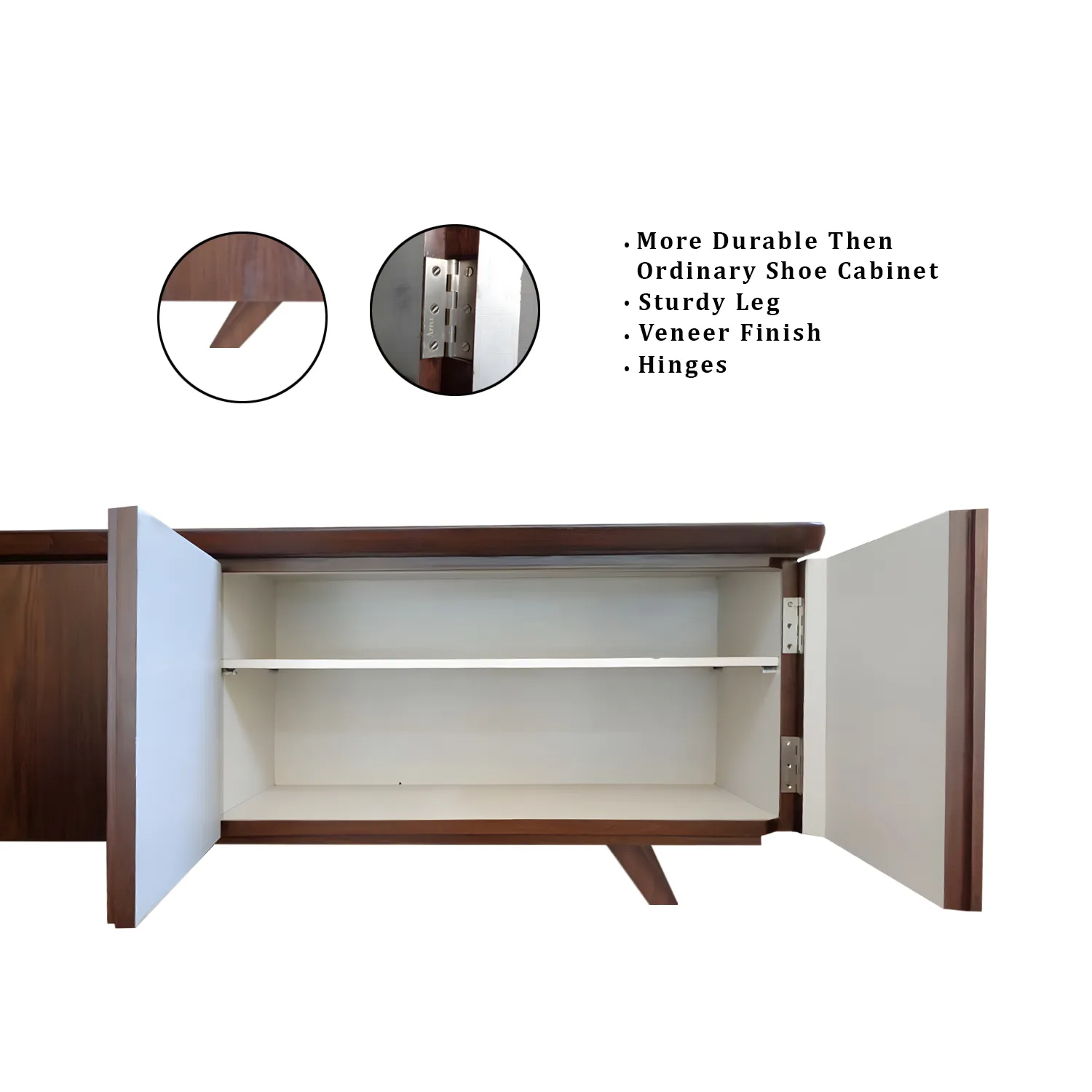A stunning fusion of form and function. Crafted from rich teak wood, this cabinet boasts a sleek, melamine finish that accentuates its natural grain. The seamless, minimalist design incorporates bottom curve edges in the shutter itself for effortless access to its spacious compartments and requires no handle which enhances its seamless beauty