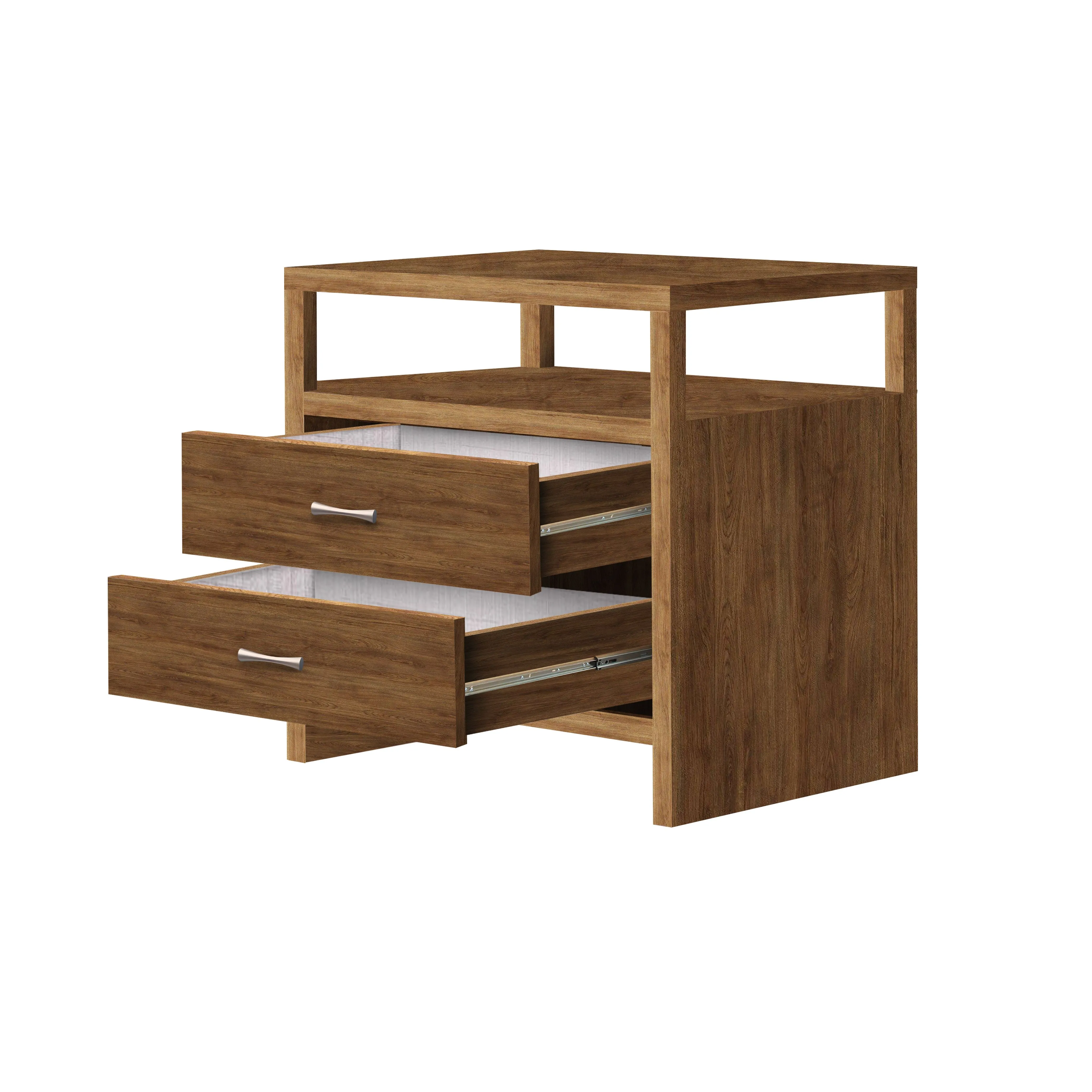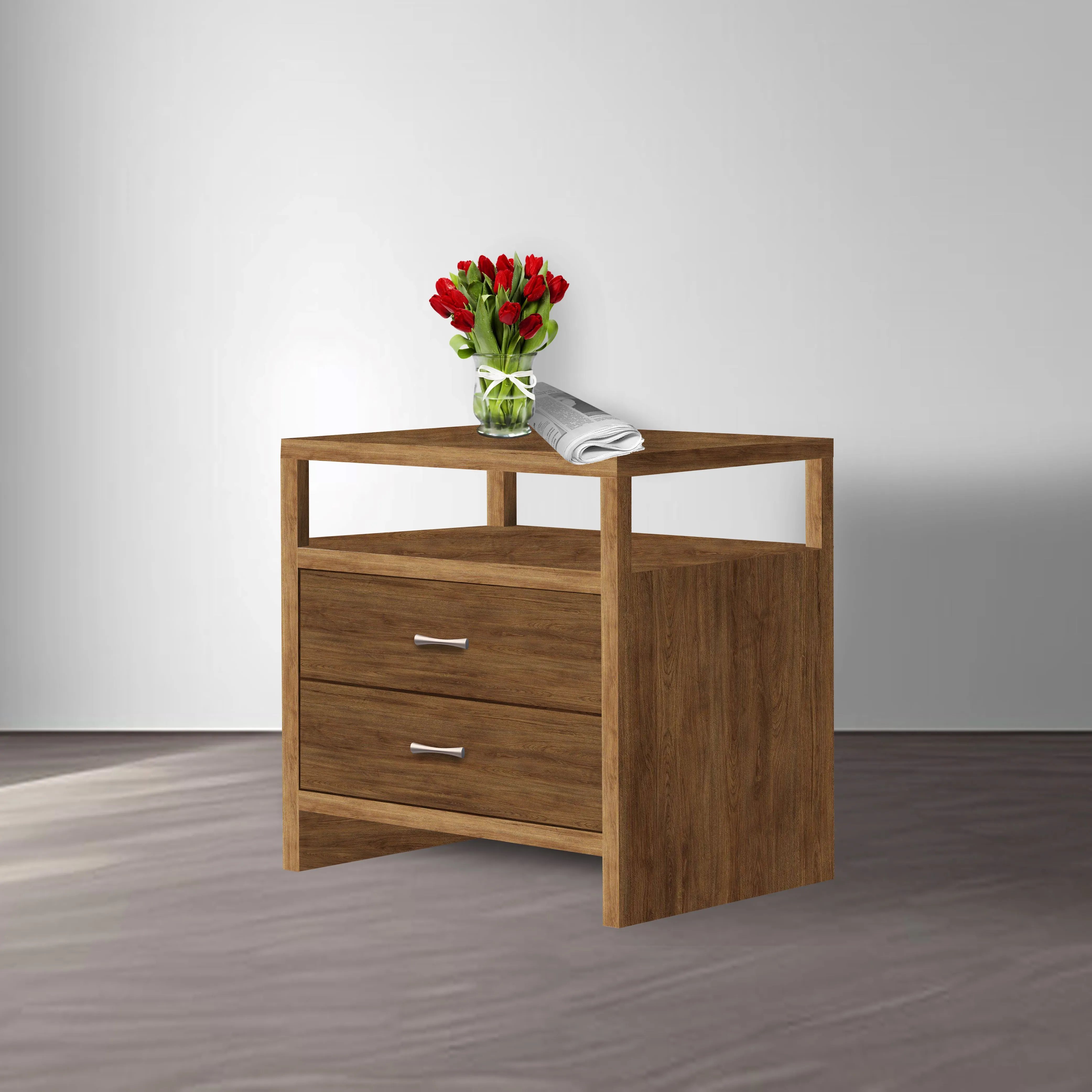 A bed side table is a small piece of furniture placed next to a bed that holds items used during bedtime routines, such as books, glasses, and lamps. It has storage spaces like drawers, shelves, or compartments, and a flat surface for easy access to items.