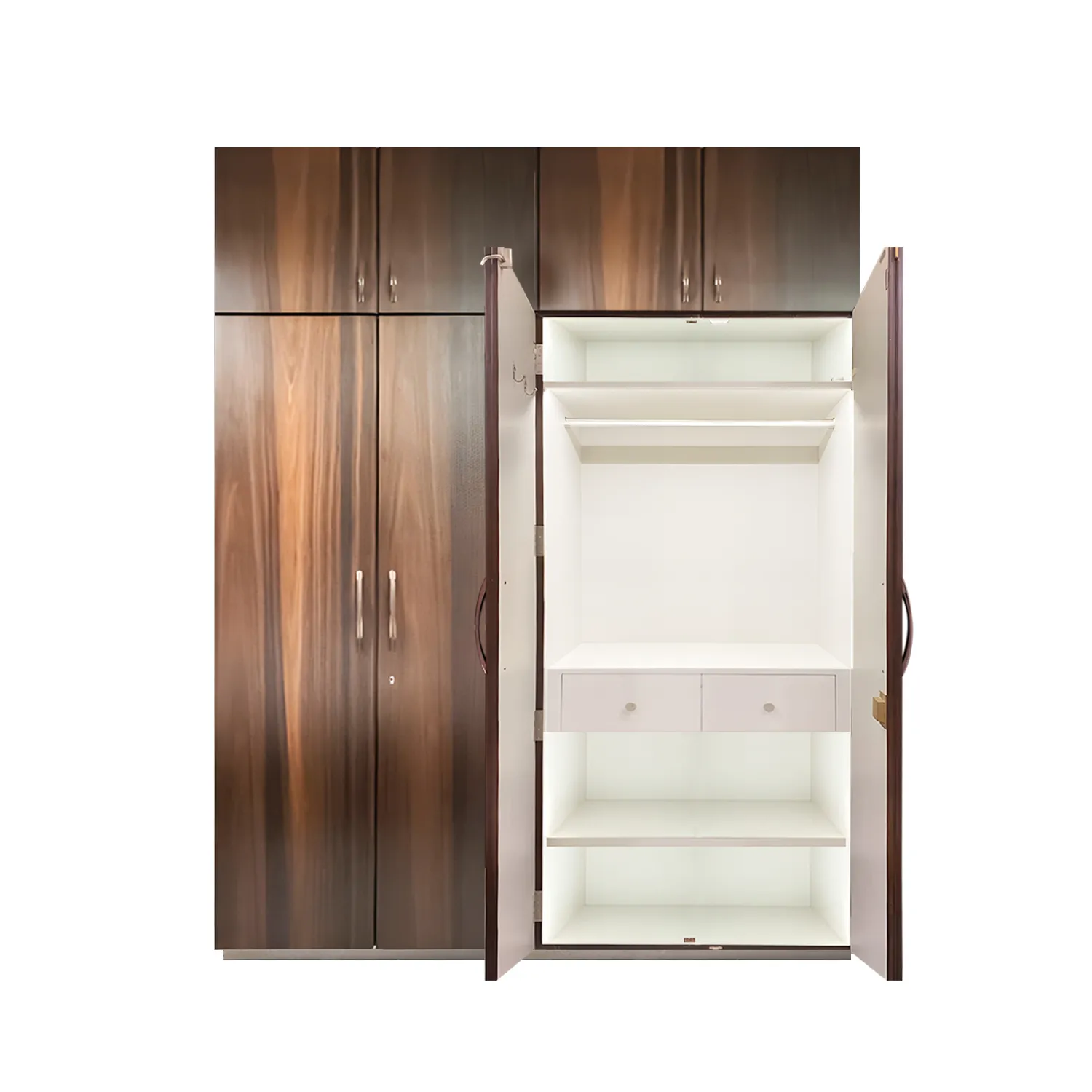 The doors have a simple panel design and are painted white. The wardrobe has four shelves inside, which are adjustable so that you can customize the storage space to fit your needs. The wardrobe also has a hanging rail at the top, which is perfect for hanging clothes. The wardrobe is a good size and has plenty of storage space. It is also very versatile and can be used in a variety of rooms, such as the bedroom, hallway, or even the living room. The white finish is neutral and will match any décor.