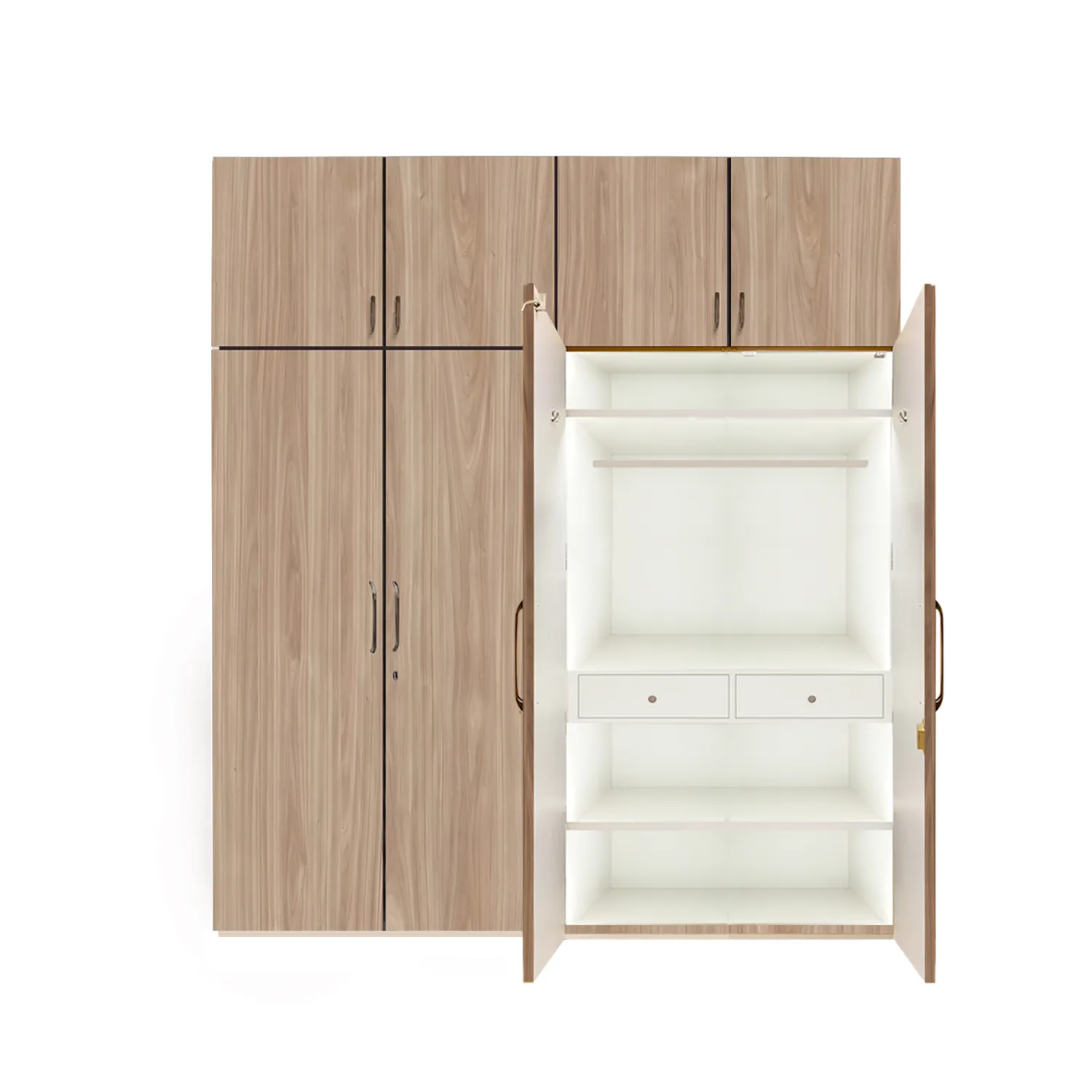 The doors have a simple panel design and are painted white. The wardrobe has four shelves inside, which are adjustable so that you can customize the storage space to fit your needs. The wardrobe also has a hanging rail at the top, which is perfect for hanging clothes. The wardrobe is a good size and has plenty of storage space. It is also very versatile and can be used in a variety of rooms, such as the bedroom, hallway, or even the living room. The white finish is neutral and will match any décor.