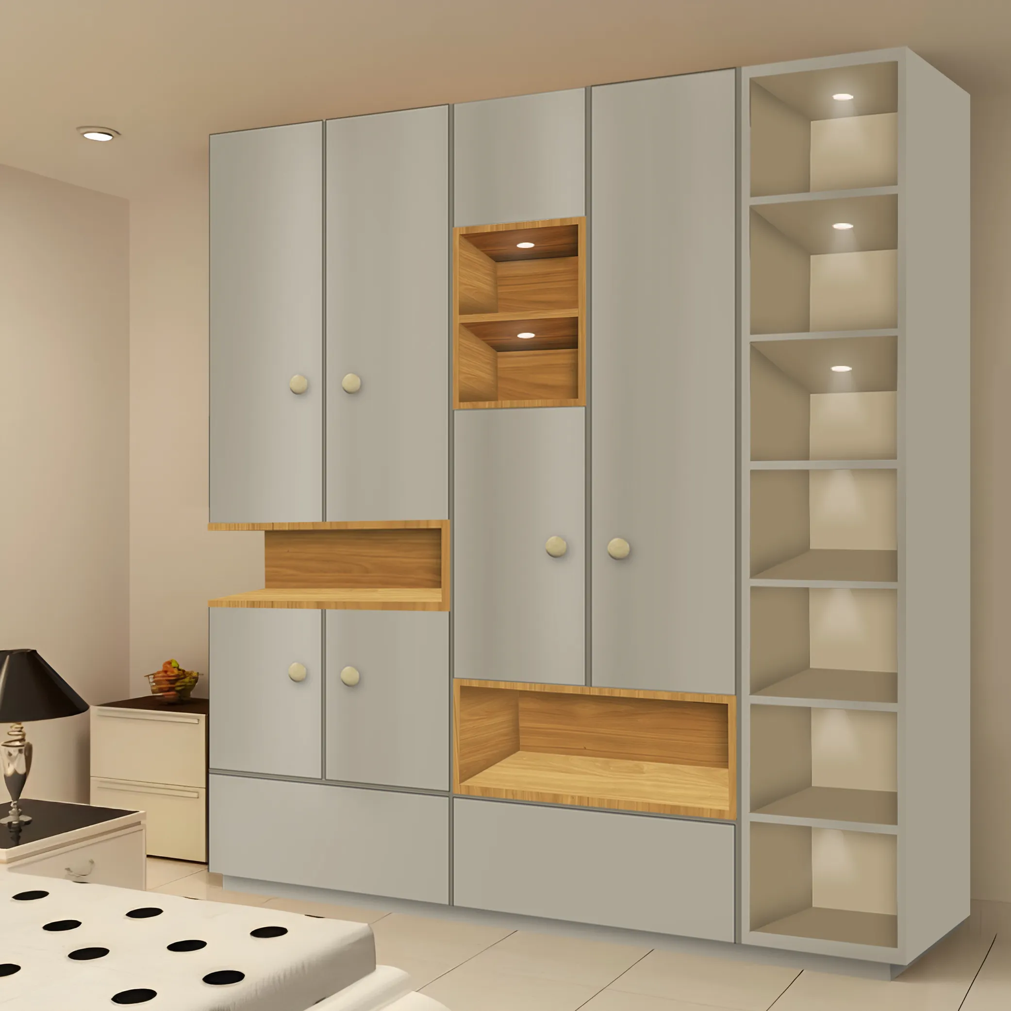 Introducing our stunning wardrobe, the ultimate storage solution for any bedroom. Crafted with premium materials and expert craftsmanship, this wardrobe is both functional and aesthetically pleasing. The four doors are made of high-quality wood. Each door is fitted with soft-close hinges, ensuring a quiet and smooth operation every time. The interior of the wardrobe is equally impressive, featuring adjustable shelves and hanging rods to accommodate a variety of clothing items.